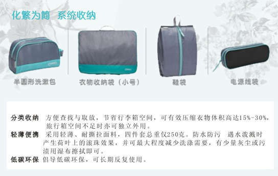【推薦理由】:分類收納 方便查找與取放,節(jié)省行李箱空間,可有效壓縮衣物體積高達15%-30%,旅行箱空間不足時亦可獨立外用。 輕薄便攜 采用輕薄、耐撕拉面料,四件套總重僅250克。防水防污 遇水潑濺時產生荷葉上的滾珠效果,有少量灰塵或污漬用濕布擦拭即可 低碳環(huán)保 倡導低碳環(huán)保,可長期反復使用。