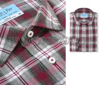 100%長(zhǎng)絨棉,紅灰起絨格紋面料,八字領(lǐng),蝶貝扣配紅線以暗紅色為主色調(diào)的格紋所碰撞出的是一種休閑中帶著沉穩(wěn)的濃郁英倫氣息。