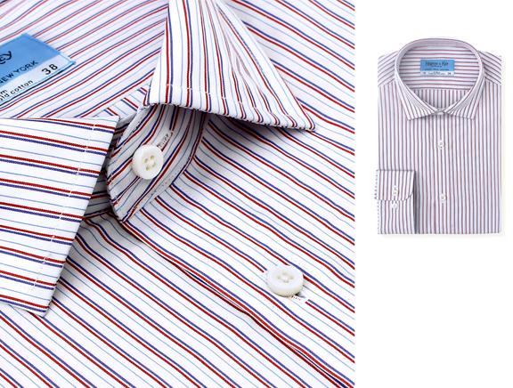 100%長(zhǎng)絨棉,紅藍(lán)色細(xì)條紋,小八字領(lǐng),嚴(yán)謹(jǐn)不失優(yōu)雅。
