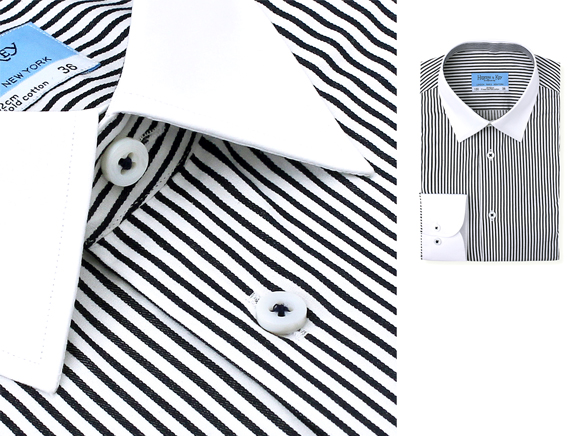 100%長絨棉,黑白條紋,領(lǐng)、袖鑲拼白色,穩(wěn)重大方的條紋就如男士所擁有大海般寬闊的胸襟,藉由此傳遞出無聲的言語,表達(dá)了一種不凡的自信與優(yōu)雅。