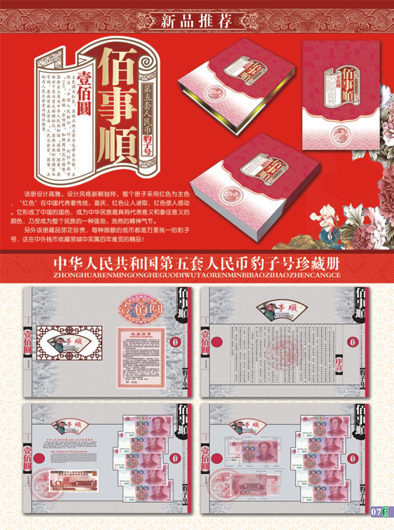 第五套人民幣一百元十連紙幣百事順珍藏冊冊內(nèi)包含:第五套人民幣一百元面值紙幣十張,貝幣一枚。紙幣號碼規(guī)律為豹子號,例如:xxxxx111—xxxxx999。