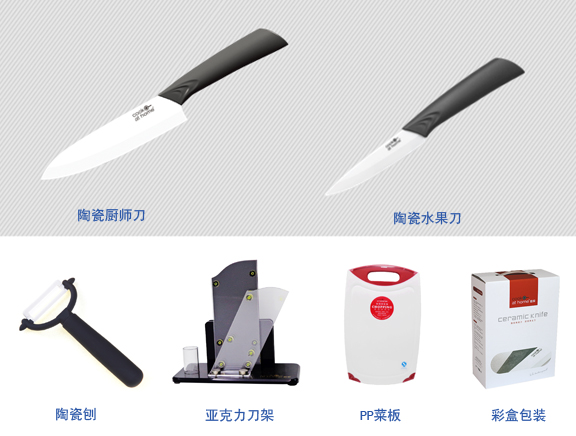 【產(chǎn)品描述】: 6”陶瓷廚師刀、4”陶瓷水果刀、陶瓷刨、PP菜板、亞克力刀架、彩盒包裝。