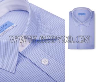 100%長絨棉,淺藍(lán)色千鳥格面料,領(lǐng)座鑲拼白色,貝殼扣,平袖口。細(xì)節(jié)體現(xiàn)品味