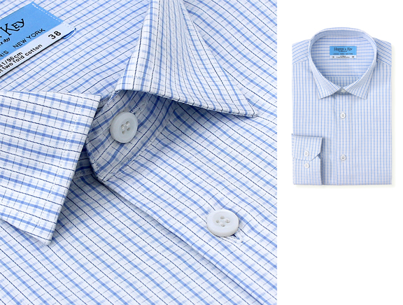 100%長絨棉,藍(lán)色小格紋,小八字領(lǐng),袖扣斜角。經(jīng)典時(shí)尚。