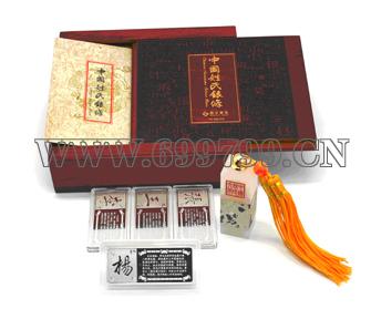 《姓氏銀條》的重量50g,成色為99.9%,經(jīng)中國貴金屬檢測中心檢測,成色標(biāo)準(zhǔn)。銀條正面左側(cè)是歷代書法名家書寫的該姓氏,右側(cè)雕刻的是中華傳統(tǒng)紋樣及該姓氏的起源介紹。每套“中國姓氏銀條”還配有“白云玉石”天工神韻印章30個姓氏1李 2王 3張 4劉 5陳 6楊 7趙 8黃 9吳 10周