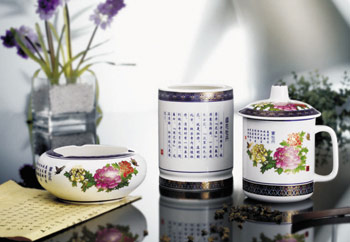 產(chǎn)品名稱: 唯雅 泰和錦上添花(三件套) 規(guī) 格: 茶杯100*140mm/筆筒100*120mm/煙缸140*60mm 材 質(zhì): 骨質(zhì)瓷,景泰藍 編 號:J2011026